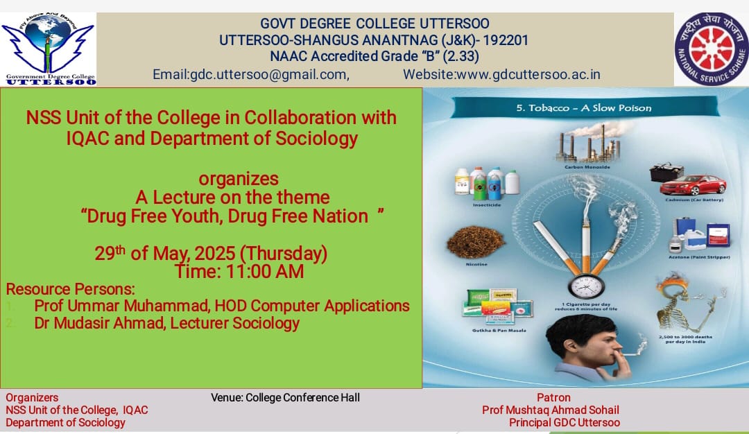 Seminar on Drug De-Addiction by NSS, IQAC & Sociology Department View this post on Instagram A post shared by GDC Uttersoo (@uttersoocollege) View