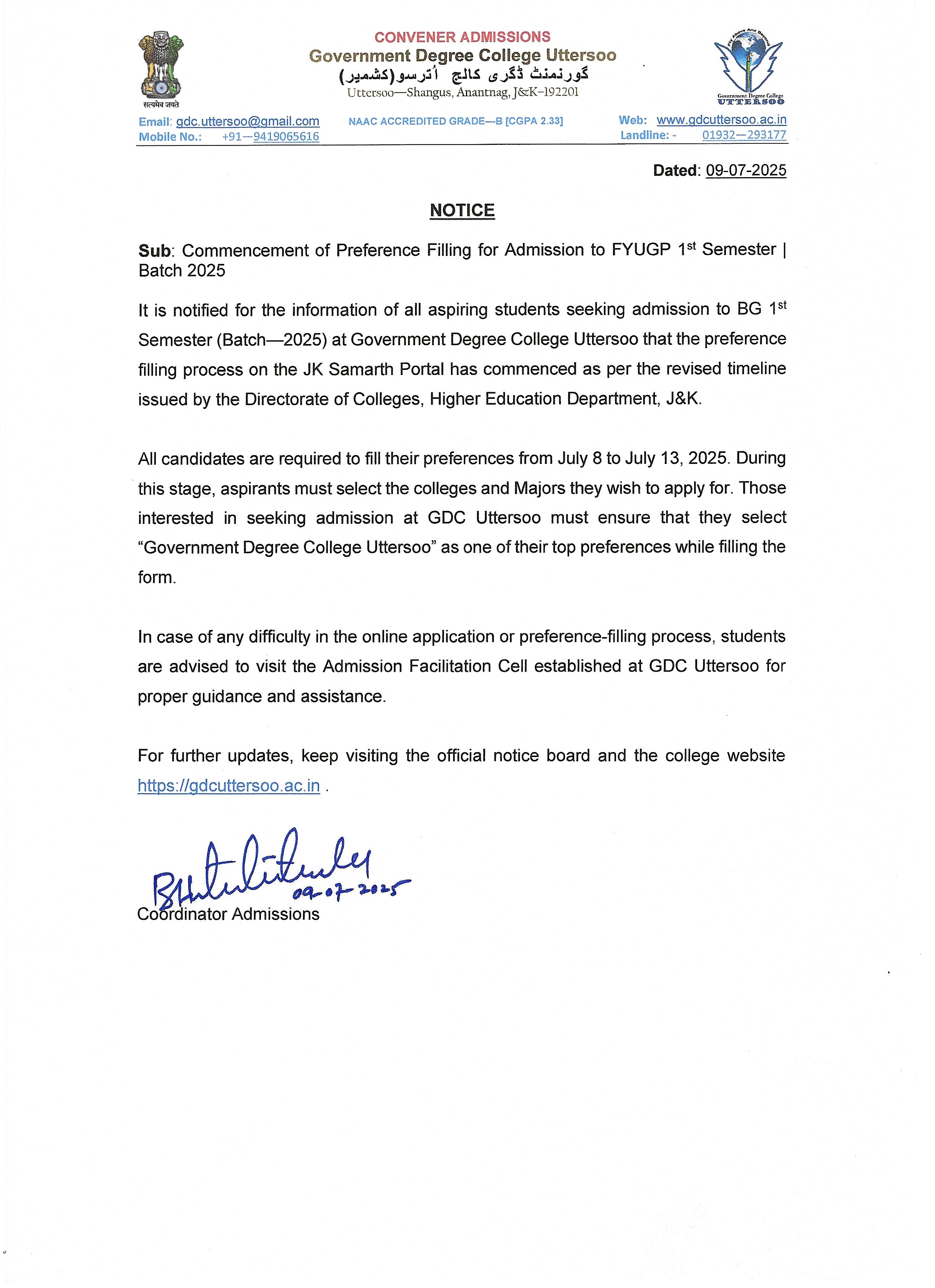 Notice: Commencement of Preference Filling for Admission to FYUGP 1st Semester | Batch 2025